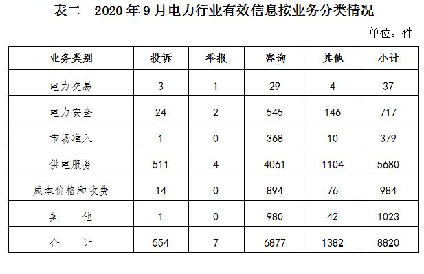 二、分類情況 2020年9月收到的有效信息中: 電力行業(yè)排在首位,有效信息數(shù)量為8820件、占全部有效信息的85.86%,其中受理的投訴舉報(bào)數(shù)量525件,占全部投訴舉報(bào)數(shù)量的91.62%。群眾反映問題主要集中在供電服務(wù)、成本價(jià)格及收費(fèi)等方面。(2020年9月電力行業(yè)有效信息按業(yè)務(wù)分類情況見表二) 新能源和可再生能源行業(yè)排在第二位,有效信息數(shù)量為468件、占全部有效信息的4.56%,其中受理的投訴舉報(bào)數(shù)量為12件,占全部投訴舉報(bào)數(shù)量的2.09%。群眾反映的問題主要集中在分布式光伏發(fā)電項(xiàng)目上網(wǎng)電費(fèi)和補(bǔ)貼結(jié)算等方面。 石油天然氣行業(yè)排在第三位,有效信息數(shù)量為332件,占全部有效信息的3.23%。群眾咨詢的問題主要集中在居民燃?xì)獍惭b及收費(fèi)等方面。 其他有效信息合計(jì)653件、占全部有效信息的6.36%。其中涉及煤炭行業(yè)的主要內(nèi)容是咨詢煤炭相關(guān)產(chǎn)業(yè)政策等方面。