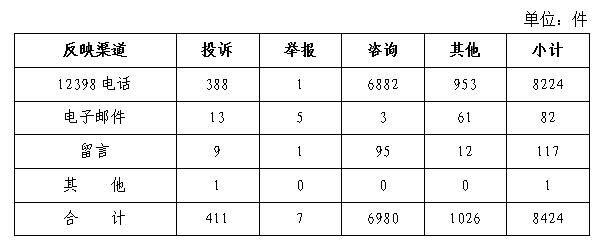 一、基本情況 2020年10月,國家能源局12398熱線共收到有效信息8424件,環(huán)比減少18%,同比增加4.62%。 按訴求性質(zhì)分類,投訴411件、占有效信息的4.88%;舉報(bào)7件、占有效信息的0.08%;咨詢6980件、占有效信息的82.86%;表揚(yáng)、求助、建議等其他方面1026件,占有效信息的12.18%。 按反映渠道分類,12398電話8224件,電子郵件82件,留言117件,其他1件。(2020年10月收到有效信息情況見表一) 表一 2020年10月收到有效信息情況