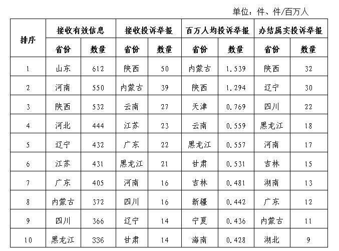 新能源和可再生能源行業(yè)排在第二位,有效信息數(shù)量為386件、占全部有效信息的4.58%;其中投訴舉報(bào)數(shù)量為12件、占全部投訴舉報(bào)數(shù)量的2.87%。 石油天然氣行業(yè)排在第三位,有效信息數(shù)量為412件、占全部有效信息的4.89%。 其他有效信息合計(jì)711件、占全部有效信息的8.44%。 三、分布情況 各省(自治區(qū)、直轄市)按照收到的有效信息數(shù)量排序,山東、河南、陜西、河北、遼寧、江蘇、廣東、內(nèi)蒙古、四川、黑龍江等列全國前10位;按照投訴舉報(bào)數(shù)量排序,陜西、內(nèi)蒙古、云南、江蘇、廣東、黑龍江、河南、四川、遼寧、甘肅等排在全國前10位。按照百萬人均投訴舉報(bào)數(shù)量排序,內(nèi)蒙古、陜西、天津、云南、黑龍江、甘肅、吉林、新疆、寧夏、海南等排在全國前10位。按照辦結(jié)屬實(shí)投訴舉報(bào)數(shù)量排序,陜西、遼寧、四川、黑龍江、河南、吉林、湖南、廣東、內(nèi)蒙古、湖北等排在全國前10位。(2020年10月有效信息及投訴舉報(bào)排名前10位情況見表三) 表三 2020年10月有效信息及投訴舉報(bào)排名前10位情況