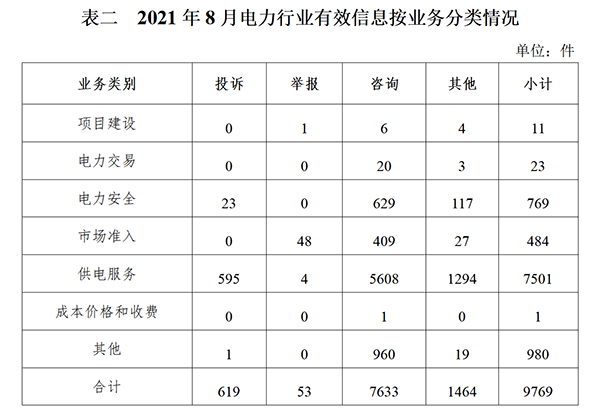 按訴求性質(zhì)分類,投訴629件,占有效信息的5.04%;舉報54件,占有效信息的0.43%;咨詢10268件,占有效信息的82.24%;表揚、求助、建議等其他方面1534件,占有效信息的12.29%。 按反映渠道分類,12398電話11945件,12398互聯(lián)網(wǎng)終端154件,電子郵件153件,留言231件,其他2件。 二、分類情況 2021年8月收到的有效信息中: 電力行業(yè)排在首位,有效信息數(shù)量為9769件,占全部有效信息的78.25%。群眾關(guān)注的內(nèi)容主要集中在故障停電、供電安全、電表計量咨詢等方面。(2021年8月電力行業(yè)有效信息按業(yè)務(wù)分類情況見表二)