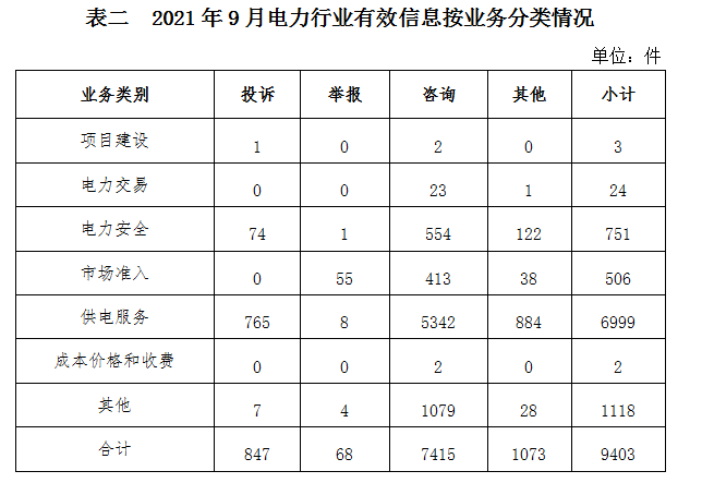 按訴求性質(zhì)分類(lèi),投訴877件,占有效信息的7.14%;舉報(bào)68件,占有效信息的0.55%;咨詢(xún)10228件,占有效信息的83.20%;表?yè)P(yáng)、求助、建議等其他方面1120件,占有效信息的9.11%。 按反映渠道分類(lèi),12398電話11617件,12398互聯(lián)網(wǎng)終端279件,電子郵件136件,留言261件。 二、分類(lèi)情況 2021年9月收到的有效信息中: 電力行業(yè)排在首位,有效信息數(shù)量為9403件,占全部有效信息的76.49%。群眾關(guān)注的內(nèi)容主要集中在有序用電、故障停電、供電安全等方面。(2021年9月電力行業(yè)有效信息按業(yè)務(wù)分類(lèi)情況見(jiàn)表二)