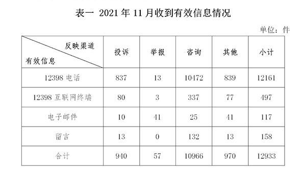 一、基本情況 2021年11月,國(guó)家能源局12398能源監(jiān)管熱線(以下簡(jiǎn)稱12398熱線)共收到有效信息12933件(包含投訴、舉報(bào)、咨詢和其他訴求類別),環(huán)比增加21.81%,同比增加34.93%。(2021年11月收到有效信息情況見表一)