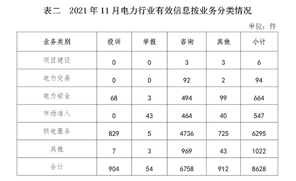 按訴求性質(zhì)分類,投訴940件,占有效信息的7.27%;舉報(bào)57件,占有效信息的0.44%;咨詢10966件,占有效信息的84.79%;表?yè)P(yáng)、求助、建議等其他方面970件,占有效信息的7.50%。 按反映渠道分類,12398電話12161件,12398互聯(lián)網(wǎng)終端497件,電子郵件117件,留言158件。 二、分類情況 2021年11月收到的有效信息中: 電力行業(yè)排在首位,有效信息數(shù)量為8628件,占全部有效信息的66.71%。群眾關(guān)注的內(nèi)容主要集中在故障停電、供電安全、電費(fèi)計(jì)量和收繳等方面。(2021年11月電力行業(yè)有效信息按業(yè)務(wù)分類情況見表二)
