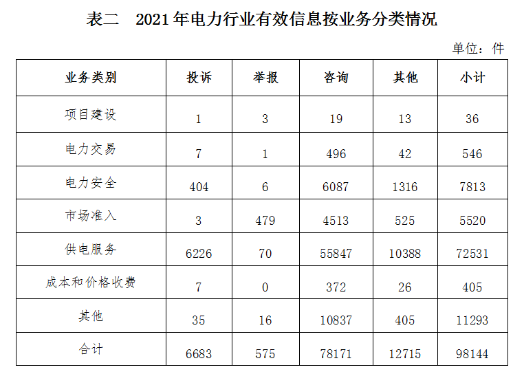 按訴求性質(zhì)分類,投訴6919件,占有效信息的5.29%;舉報(bào)587件,占有效信息的0.45%;咨詢109867件,占有效信息的84.04%;表揚(yáng)、求助、建議等其他方面13362件,占有效信息的10.22%。 按反映渠道分類,12398電話125012件,12398互聯(lián)網(wǎng)終端2220件,傳真2件,電子郵件1582件,留言1919件。 二、分類情況 2021年收到的有效信息中: 電力行業(yè)排在首位,有效信息數(shù)量為98144件,占全部有效信息的75.07%。群眾關(guān)注的內(nèi)容主要集中在故障停電、供電安全、電費(fèi)計(jì)量和收繳等方面。(2021年電力行業(yè)有效信息按業(yè)務(wù)分類情況見表二)