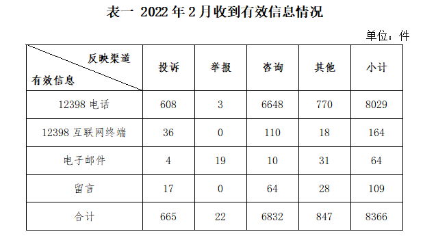 一、基本情況 2022年2月,國家能源局12398能源監(jiān)管熱線(以下簡稱12398熱線)共收到有效信息8366件(包含投訴、舉報(bào)、咨詢和其他訴求類別),環(huán)比減少30.68%,同比增加10.27%。(2022年2月收到有效信息情況見表一)