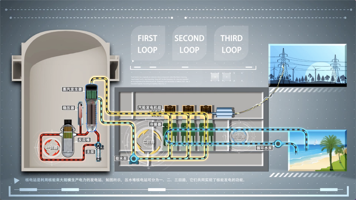 核能也稱原子能,是原子核結(jié)構(gòu)發(fā)生變化時釋放出來的巨大能量,包括裂變能和聚變能兩種主要形式。目前核能發(fā)電利用的是裂變能。以壓水堆核電站為例,核燃料在反應(yīng)堆中通過核裂變產(chǎn)生的熱量加熱一回路高壓水,一回路水通過蒸汽發(fā)生器加熱二回路水使之變?yōu)檎羝?。蒸汽通過管路進(jìn)入汽輪機(jī),推動汽輪發(fā)電機(jī)發(fā)電,發(fā)出的電通過電網(wǎng)送至千家萬戶。整個過程的能量轉(zhuǎn)換是由核能轉(zhuǎn)換為熱能,熱能轉(zhuǎn)換為機(jī)械能,機(jī)械能再轉(zhuǎn)換為電能。核電站可分為兩部分,一是核島,包括反應(yīng)堆廠房、輔助廠房、核燃料廠房和應(yīng)急柴油機(jī)廠房。二是常規(guī)島,包括汽輪發(fā)電機(jī)廠房和海水泵房。我國目前核電站采用的堆型有壓水堆、重水堆、高溫氣冷堆和快中子堆。