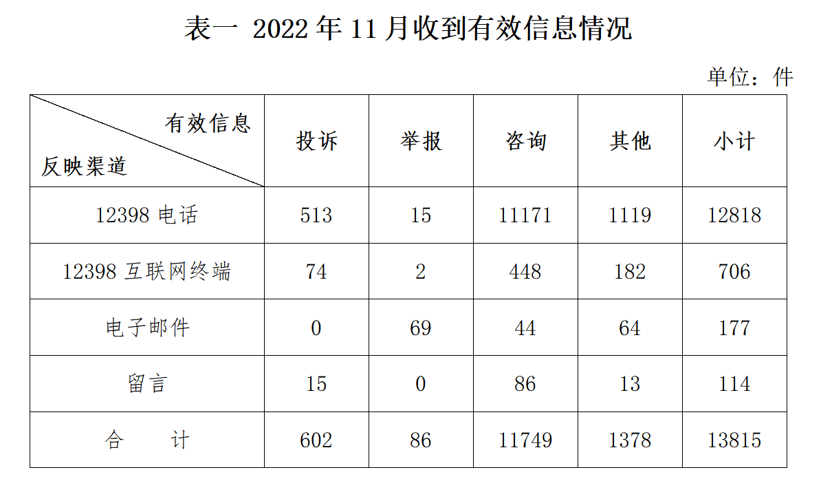 一、基本情況 2022年11月,國家能源局12398能源監(jiān)管熱線(以下簡稱12398熱線)共收到有效信息13815件(包含投訴、舉報、咨詢和其他訴求類別),環(huán)比增加4.36%,同比增加6.82%。(2022年11月收到有效信息情況見表一)