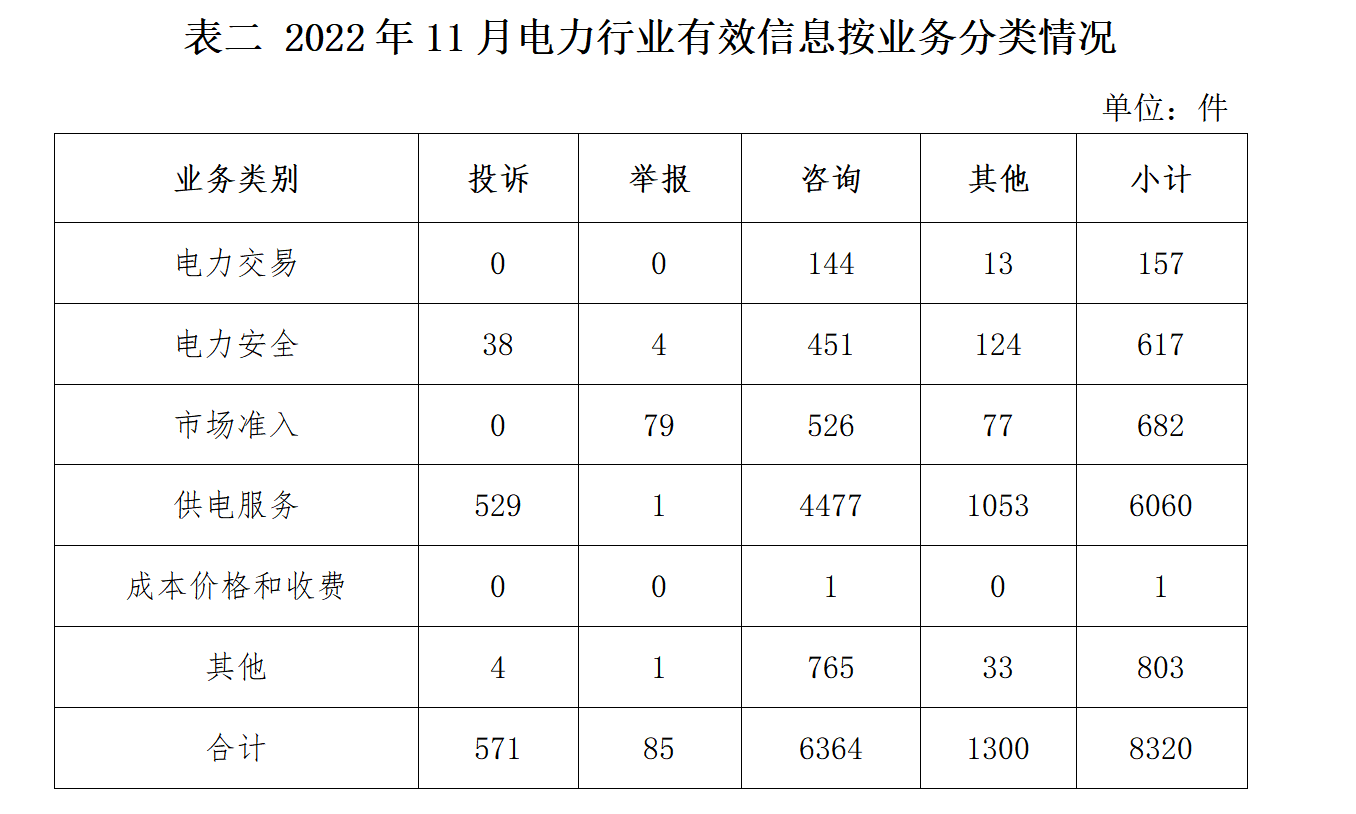 按訴求性質(zhì)分類,投訴602件,占有效信息的4.36%;舉報86件,占有效信息的0.62%;咨詢11749件,占有效信息的85.05%;表揚(yáng)、求助、建議等其他方面1378件,占有效信息的9.97%。 按反映渠道分類,12398電話12818件,12398互聯(lián)網(wǎng)終端706件,電子郵件177件,留言114件。 二、分類情況 2022年11月收到的有效信息中: 電力行業(yè)排在首位,有效信息數(shù)量為8320件,占全部有效信息的60.22%。群眾關(guān)注的內(nèi)容主要集中在供電服務(wù)、電力安全、市場準(zhǔn)入等方面。(2022年11月電力行業(yè)有效信息按業(yè)務(wù)分類情況見表二)