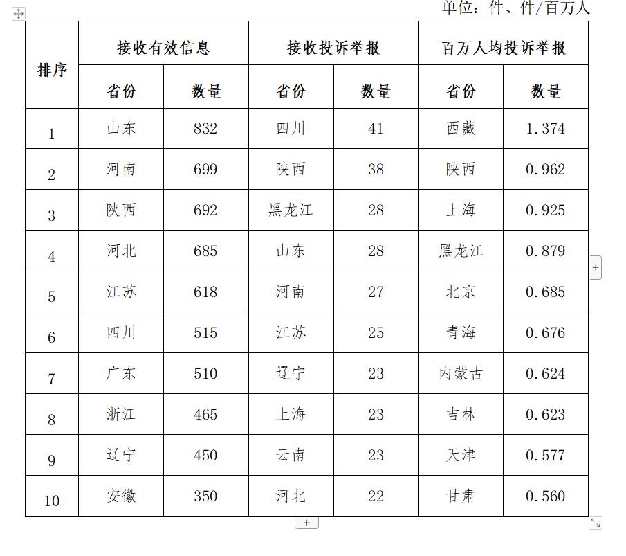 石油天然氣行業(yè)排在第二位,有效信息數(shù)量為1323件,占全部有效信息的12.89%。群眾關注的內(nèi)容主要集中在居民燃氣安裝及收費、燃氣故障等方面。 新能源和可再生能源行業(yè)排在第三位,有效信息數(shù)量為591件,占全部有效信息的5.76%。群眾關注的內(nèi)容主要集中在分布式光伏發(fā)電項目并網(wǎng),電費結(jié)算、補貼發(fā)放等方面。 煤炭行業(yè)有效信息數(shù)量為29件,占全部有效信息的0.28%。群眾關注的內(nèi)容主要集中在煤炭價格、煤礦安全等方面。 其他有效信息合計1098件,占全部有效信息的10.70%。 三、分布情況 各?。ㄗ灾螀^(qū)、直轄市)按照接收的有效信息數(shù)量排序,山東、河南、陜西、河北、江蘇、四川、廣東、浙江、遼寧、安徽排在全國前10位;按照接收的投訴舉報數(shù)量排序,四川、陜西、黑龍江、山東、河南、江蘇、遼寧、上海、云南、河北排在全國前10位;按照百萬人均投訴舉報數(shù)量排序,西藏、陜西、上海、黑龍江、北京、青海、內(nèi)蒙古、吉林、天津、甘肅排在全國前10位。(2023年2月有效信息及投訴舉報排名前10位情況見表三) 表三 2023年2月有效信息及投訴舉報排名前10位情況