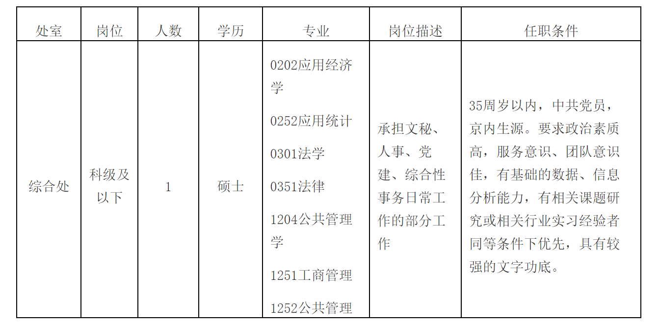 綜合處主任科員及以下崗位1人(京內(nèi)生源的碩士應屆畢業(yè)生)。35周歲以內(nèi),中共黨員,要求政治素質高,服務意識、團隊意識佳,有基礎的數(shù)據(jù)、信息分析能力,同等條件下有相關課題研究或相關行業(yè)實習經(jīng)驗者優(yōu)先,具有較強的文字功底。具體要求詳見下表。