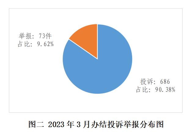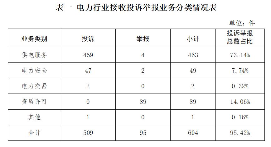 圖一 2023年3月接收投訴舉報分布圖 ?。ㄒ唬┓诸惽闆r 1.按被投訴舉報行業(yè)分類 電力行業(yè)排在首位,數(shù)量為604件、占投訴舉報總數(shù)的95.42%,主要集中在供電服務(wù)、電力安全、電力交易、資質(zhì)許可等方面。(詳見表一)