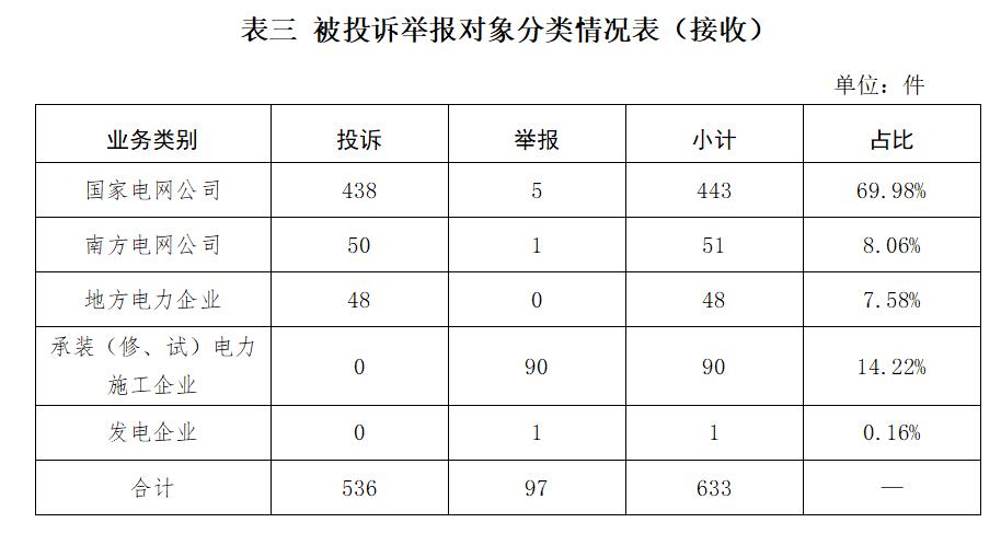 2.按被投訴舉報對象分類 針對供電企業(yè)的投訴舉報542件、占比85.62%,其中國家電網(wǎng)公司443件、占比69.98%,南方電網(wǎng)公司51件、占比8.06%,地方電力企業(yè)48件、占比7.58%;針對承裝(修、試)電力施工企業(yè)的投訴舉報90件、占比14.22%;針對發(fā)電企業(yè)的投訴舉報1件、占比0.16%。(詳見表三)