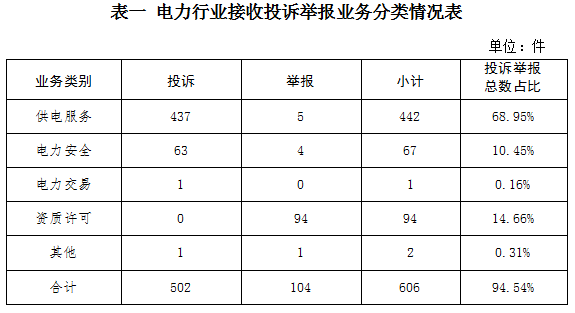 圖一 2023年4月接收投訴舉報(bào)分布圖 ?。ㄒ唬┓诸惽闆r 1.按被投訴舉報(bào)行業(yè)分類 電力行業(yè)排在首位,數(shù)量為606件、占投訴舉報(bào)總數(shù)的94.54%,主要集中在供電服務(wù)、資質(zhì)許可、電力安全、電力交易等方面。