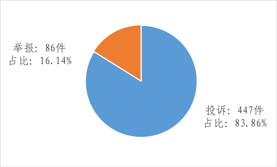 圖二 2023年4月辦結(jié)投訴舉報(bào)分布圖 從被投訴舉報(bào)對(duì)象看,供電企業(yè)450件、占投訴舉報(bào)總數(shù)的84.43%,其中國家電網(wǎng)公司369件、占投訴舉報(bào)總數(shù)的69.23%,南方電網(wǎng)公司39件、占投訴舉報(bào)總數(shù)的7.32%,地方電力企業(yè)42件、占投訴舉報(bào)總數(shù)的7.88%;承裝(修、試)電力施工企業(yè)79件、占投訴舉報(bào)總數(shù)的14.82%;發(fā)電企業(yè)3件、占投訴舉報(bào)總數(shù)的0.56%;其他市場主體1件、占投訴舉報(bào)總數(shù)的0.19%。
