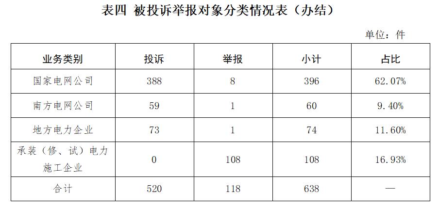 ?。ǘ┑貐^(qū)分布情況 各?。ㄗ灾螀^(qū)、直轄市)按照接收投訴舉報數(shù)量排序,內(nèi)蒙古、山東、黑龍江、四川、河北排在全國前5位。其中:按投訴數(shù)量排序,內(nèi)蒙古、山東、黑龍江、四川、吉林(遼寧并列)排在全國前5位;按舉報數(shù)量排序,浙江、四川、河北、廣東、黑龍江(山東并列)排在全國前5位;按百萬人均投訴舉報數(shù)量排序,內(nèi)蒙古、黑龍江、青海、吉林、西藏排在全國前5位。(全國接收投訴舉報地區(qū)分布情況詳見附件1) ?。ㄈ┲饕獑栴} 2023年5月,接收的投訴舉報主要反映了4個方面的問題。 1.電能質(zhì)量問題。部分地區(qū)供電設(shè)施老舊,網(wǎng)架比較薄弱,供電半徑長、供電線徑小,導(dǎo)致出現(xiàn)停電、低電壓等電能質(zhì)量問題。 投訴舉報量靠前的2個?。▍^(qū))為內(nèi)蒙古(20件)、四川(14件)。 2.承裝(修、試)電力設(shè)施許可問題。少數(shù)企業(yè)提供虛假材料,使用其他企業(yè)員工相關(guān)證件申請承裝(修、試)電力設(shè)施許可證。 投訴舉報量靠前的2個省份為浙江(11件)、四川(9件)。 3.停電搶修問題。個別供電企業(yè)計劃檢修安排不合理、搶修力量投入不足,導(dǎo)致停電后未及時恢復(fù)供電,影響群眾正常用電。 投訴舉報量靠前的2個?。▍^(qū))為內(nèi)蒙古(12件)、黑龍江(10件)。 4.新能源和可再生能源行業(yè)相關(guān)問題。分布式光伏發(fā)電項目并網(wǎng)存在困難,上網(wǎng)電費結(jié)算、補貼轉(zhuǎn)付不及時等。 投訴舉報量靠前的2個省份為山東(7件)、河南(3件)。 二、當月處理情況 ?。ㄒ唬┦芾砬闆r 2023年5月,根據(jù)國家有關(guān)法規(guī)政策規(guī)定,國家能源局派出機構(gòu)對屬于監(jiān)管職責范圍的733件投訴舉報進行了受理,占接收數(shù)量的93.26%;其他不予受理的,已按照國家有關(guān)法規(guī)政策進行了及時轉(zhuǎn)辦,并將有關(guān)情況及時告知了當事人。 ?。ǘ┺k結(jié)情況 2023年5月,國家能源局派出機構(gòu)辦結(jié)投訴舉報638件(含往期結(jié)轉(zhuǎn)),環(huán)比增長31.55%、同比下降24.21%,累計辦結(jié)率97.99%。其中:投訴520件,環(huán)比增長28.71%、同比下降33.76%;舉報118件,環(huán)比增長45.68%、同比增長100.00%。