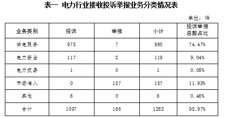 ?。ㄒ唬┓诸惽闆r 1.按被投訴舉報行業(yè)分類 電力行業(yè)排在首位,數(shù)量為1263件、占投訴舉報總數(shù)的95.97%,主要集中在供電服務、市場準入、電力安全等方面。