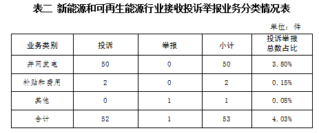 新能源和可再生能源行業(yè)排在第二位,數(shù)量為53件、占投訴舉報總數(shù)的4.03%,主要集中在并網(wǎng)發(fā)電、補貼和費用等方面。