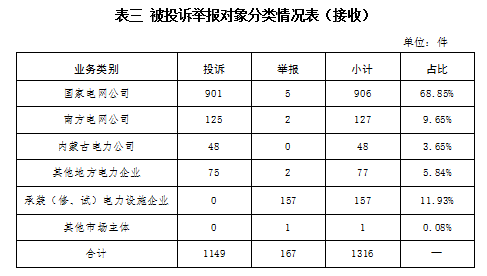 2.按被投訴舉報對象分類 供電企業(yè)1158件、占投訴舉報總數(shù)的87.99%,其中國家電網(wǎng)公司906件、占投訴舉報總數(shù)的68.85%,南方電網(wǎng)公司127件、占投訴舉報總數(shù)的9.65%,內蒙古電力公司48件、占投訴舉報總數(shù)的3.65%,其他地方電力企業(yè)77件、占投訴舉報總數(shù)的5.84%;承裝(修、試)電力設施企業(yè)157件、占投訴舉報總數(shù)的11.93%;其他市場主體1件、占投訴舉報總數(shù)的0.08%。