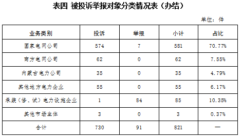 從被投訴舉報對象看,供電企業(yè)733件、占投訴舉報總數(shù)的89.28%,其中國家電網(wǎng)公司581件、占比70.77%,南方電網(wǎng)公司62件、占比7.55%,內蒙古電力公司35件、占比3.65%,其他地方電力企業(yè)55件、占比6.17%;承裝(修、試)電力設施企業(yè)85件、占比10.35%;其他市場主體3件、占比0.37%。