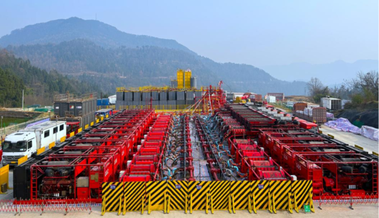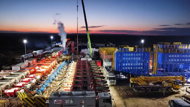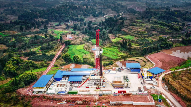 大慶古龍頁巖油產區(qū) 長慶慶城油田加大長7頁巖油研究攻關力度,圍繞新類型紋層型頁巖油開展試驗,5口水平井壓裂試油均獲成功。創(chuàng)新布井模式,形成了“短悶、強排、控采”全生命周期技術,開發(fā)效果穩(wěn)步提升,儲量動用程度由50%提升到85%。2023年頁巖油產量207萬噸,連續(xù)五年保持30萬噸增長。 ?。ǘ╉搸r氣發(fā)展向深層跨越,突破邁進新層系 頁巖氣國家級示范區(qū)建設穩(wěn)步推進。長寧-威遠頁巖氣田精細劃分開發(fā)單元,針對性制定調整措施,鉆獲威215、自208等一批評價井,展示外圍區(qū)良好潛力,有力支撐長寧-威遠區(qū)塊全年穩(wěn)產超95億立方米。涪陵頁巖氣田立體開發(fā)提高采收率技術持續(xù)提升,焦石壩區(qū)塊形成“中北區(qū)三層立體開發(fā)、南區(qū)中上部氣層聯(lián)合開發(fā)”模式,有利區(qū)采收率最高可達44.6%,實現(xiàn)儲量效益動用,年產量超85億立方米。 頁巖氣持續(xù)縱深發(fā)展,積極探索新區(qū)新層系。隨著中國石化的金石103井、中國石油的資201、威頁1井先后在寒武系筇竹寺組地層獲高產工業(yè)氣流,揭開寒武系超深層頁巖氣萬億級規(guī)模增儲的新陣地。普光二疊系大隆組海相深層頁巖氣部署實施的雷頁1HF井,完鉆井深5880米,率先在四川盆地實現(xiàn)二疊系深層頁巖氣勘探重大突破,評價落實資源量1727億立方米。紅星二疊系茅四段、吳二段千億立方米規(guī)模增儲陣地進一步落實,培育形成“兩層樓”勘探新場面。