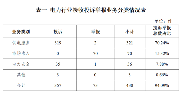 2024年3月,國家能源局12398能源監(jiān)管熱線(以下簡稱12398熱線)共接收投訴舉報457件,辦結投訴舉報530件(含往期結轉)?,F(xiàn)將有關情況通報如下: 一、當月接收情況 2024年3月,12398熱線共接收投訴舉報457件,同比下降28.44%、環(huán)比增長5.79%。其中:投訴383件,同比下降28.54%、環(huán)比下降4.73%;舉報74件,同比下降23.71%、環(huán)比增長146.67%。 ?。ㄒ唬┓诸惽闆r 1.按被投訴舉報行業(yè)分類 電力行業(yè)排在首位,數(shù)量為430件、占投訴舉報總數(shù)的94.09%,主要集中在供電服務、市場準入、電力安全等方面。 ?