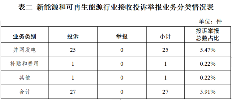 ![]() 新能源和可再生能源行業(yè)排在第二位,數(shù)量為27件、占投訴舉報總數(shù)的5.91%,主要集中在并網(wǎng)發(fā)電方面。