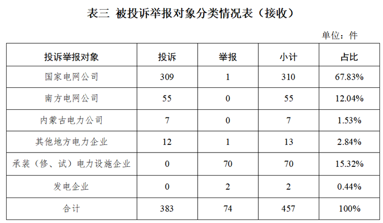 2.按被投訴舉報對象分類 供電企業(yè)385件、占投訴舉報總數(shù)的84.24%,其中國家電網(wǎng)公司310件、占投訴舉報總數(shù)的67.83%,南方電網(wǎng)公司55件、占投訴舉報總數(shù)的12.04%,內(nèi)蒙古電力公司7件、占投訴舉報總數(shù)的1.53%,其他地方電力企業(yè)13件、占投訴舉報總數(shù)的2.84%;承裝(修、試)電力設施企業(yè)70件、占投訴舉報總數(shù)的15.32%;發(fā)電企業(yè)2件、占投訴舉報總數(shù)的0.44%。