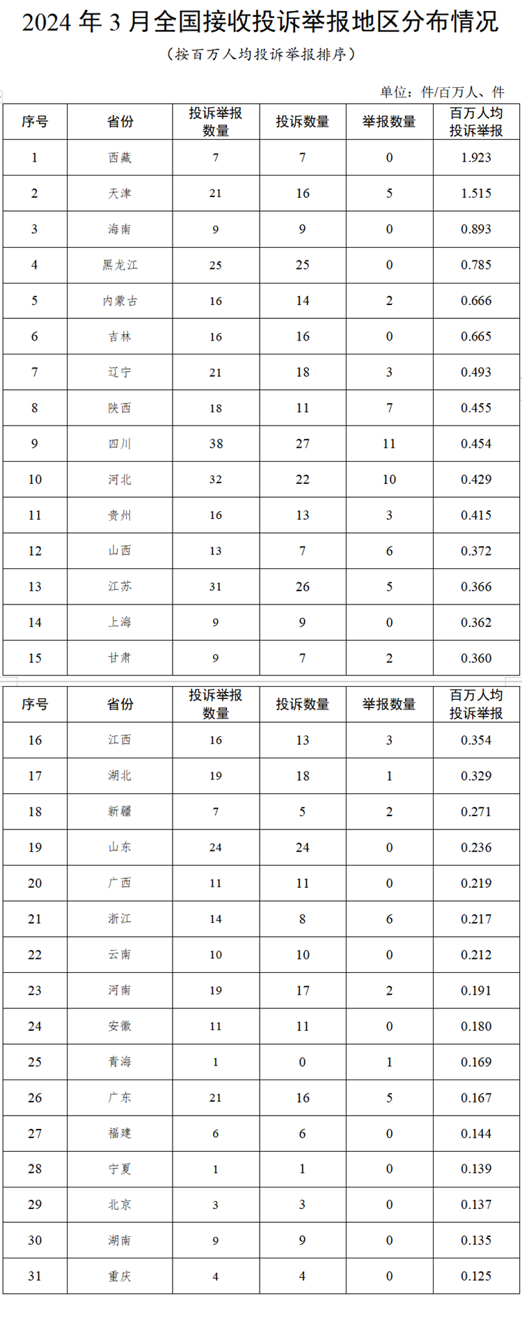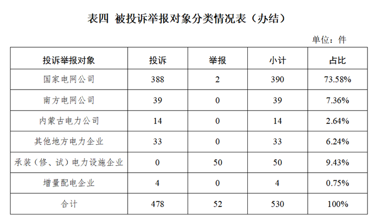(二)地區(qū)分布情況 各?。ㄗ灾螀^(qū)、直轄市)按照接收投訴舉報數(shù)量排序,四川、河北、江蘇、黑龍江、山東排在全國前5位。按百萬人均投訴舉報數(shù)量排序,西藏、天津、海南、黑龍江、內(nèi)蒙古排在全國前5位。(2024年3月全國接收投訴舉報地區(qū)分布情況,見附件1) (三)主要問題 2024年3月,接收的投訴舉報主要反映了4個方面的問題。 1.電能質量問題。受線路設備故障、臺區(qū)末端供電能力不足等因素影響,導致故障停電、低電壓等問題。 投訴舉報數(shù)量靠前的2個省份為黑龍江(11件)、四川(9件)。 2.承裝(修、試)電力設施許可問題。承裝(修、試)電力設施企業(yè)未及時在資質和信用信息系統(tǒng)解綁已離職人員信息,造成人員信息占用,影響其他企業(yè)申請許可證。 舉報數(shù)量靠前的2個省份為四川(11件)、河北(10件)。 3.停電搶修問題。受東北、內(nèi)蒙古、西藏等部分地區(qū)低溫雨雪冰凍災害影響,個別供電企業(yè)在發(fā)生故障停電后,搶修時間較長或用戶欠費停電后復電時間較長。 投訴舉報數(shù)量靠前的2個省份為黑龍江(6件)、四川(6件)。 4.新能源和可再生能源行業(yè)相關問題。部分地區(qū)分布式光伏發(fā)電項目因當?shù)嘏_區(qū)容量不足導致并網(wǎng)困難。 投訴舉報數(shù)量靠前的2個省份為江西(5件)、河南(4件)。 二、當月處理情況 ?。ㄒ唬┦芾砬闆r 2024年3月,根據(jù)國家有關法規(guī)政策規(guī)定,國家能源局派出機構對屬于監(jiān)管職責范圍的439件投訴舉報進行了受理,占接收數(shù)量的96.06%;其他不予受理的,已按照國家有關法規(guī)政策及時轉辦。 ?。ǘ┺k結情況 2024年3月,國家能源局派出機構辦結投訴舉報530件(含往期結轉),同比下降30.17%、環(huán)比增長0.76%,累計辦結率98.98%。其中:投訴478件,同比下降30.32%、環(huán)比下降3.04%;舉報52件,同比增長57.58%、環(huán)比下降28.77%。 從被投訴舉報對象看,供電企業(yè)476件、占投訴舉報總數(shù)的89.82%,其中國家電網(wǎng)公司390件、占比73.58%;南方電網(wǎng)公司39件、占比7.36%;內(nèi)蒙古電力公司14件、占比2.64%;其他地方電力企業(yè)33件、占比6.24%;承裝(修、試)電力設施企業(yè)50件、占比9.43%;增量配電企業(yè)4件、占比0.75%。