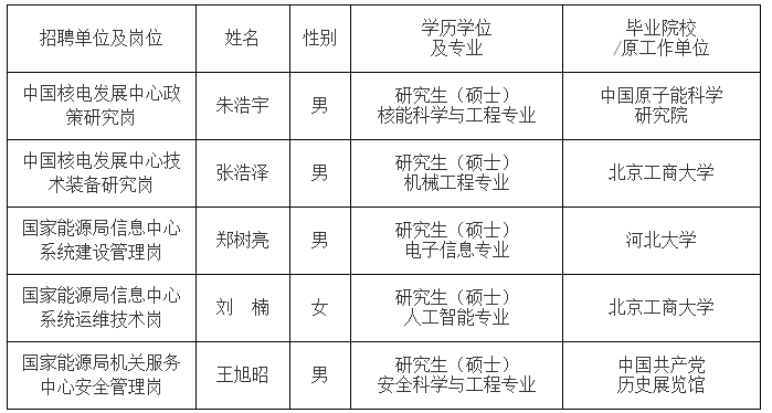 公开事项名称: 国家能源局直属事业单位2025年度公开招聘拟聘用人员公示